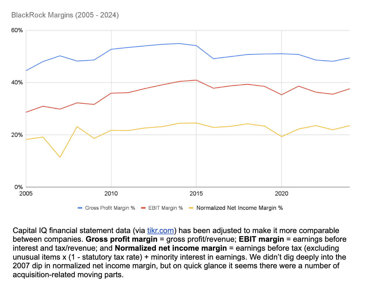 There are a range of ways that asset managers can generate profit. For one type of asset manager, performance at the investment fund level may be most important. BlackRock hopes to make this type of fee more central to its identity with its acquisitions of HPS, GIP, and Preqin. However, as we saw above, performance fees accounted for a little under 6% of all revenue in 2024. For now, most of BlackRock’s revenue is generated by relatively low and steady base fees earned on both index and active funds, and recurring fees for various services.