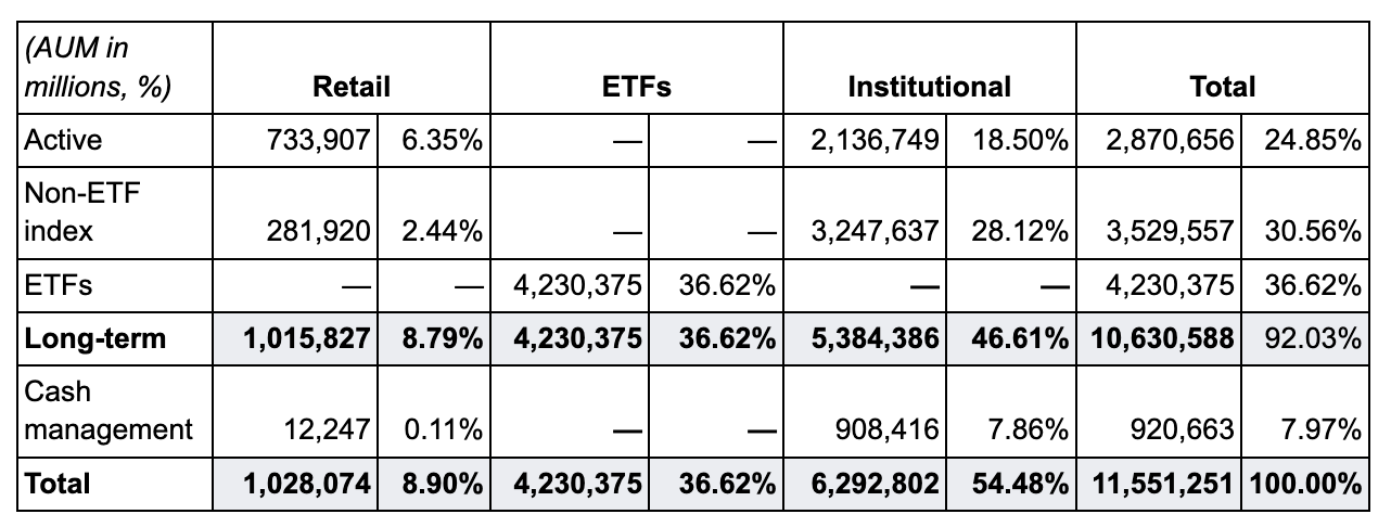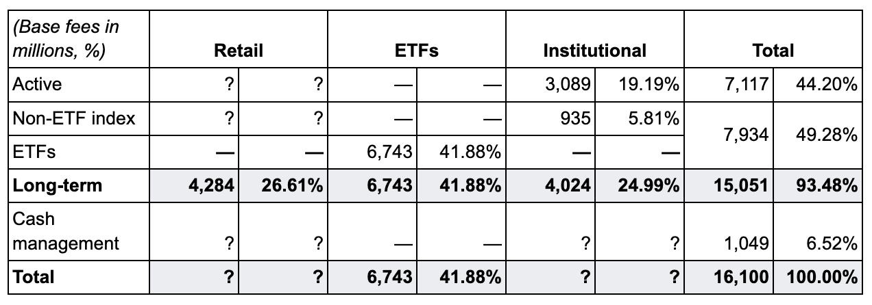 Institutional investors appear to pay less: they account for about 51% of all long-term AUM but only about 45% of base fees derived from long-term AUM. The same two factors might explain this. Institutional investors have greater negotiating power, and more of their money is invested in lower-fee index funds. As with retail clients, we’re only provided with base fees derived from long-term AUM managed for institutional clients. However, we know from the AUM disclosures that there was a split of approximately 40% invested in active funds and 60% in index funds. Despite that split, about 77% of the long-term institutional base fees were derived from the active funds.