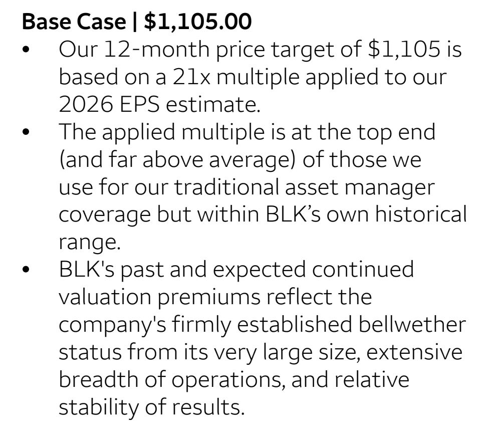 The company’s profitability in turn shapes its stock price, which is typically valued as a multiple of expected earnings per share. As an example, the image below shows that Wells Fargo analysts have a 1-year target price of $1,105 for BlackRock’s stock based on a multiple of 21x their estimate of earnings per share in 2026.[11] This follows a convention of projecting future earnings—one year ahead in this case—and calculating a terminal value.[12] Noteworthy here is the disclosure that 21x is at the “top end” of traditional asset managers, and the analysts explain that they chose it because of BlackRock’s size, breadth of operations, and stability of results. Elsewhere in the report, the analysts highlight technology services, “durable fund flow” (organic growth of AUM), and “potential major benefits from acquisitions announced in 2024.” Importantly, the last detail refers to the acquisitions of GIP, HPS and Preqin. Preqin itself is not a high-fee business, but its integration with Aladdin and other technology services will be part of BlackRock’s overall strategy for building out its private markets business.